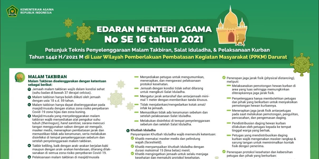 | Surat Edaran Menteri Agama Nomor 16 Tahun 2021 Tentang Juknis Qurban Takbiran dan Shalat Idul Adha 2021. Dok. Kemenag.go.id |